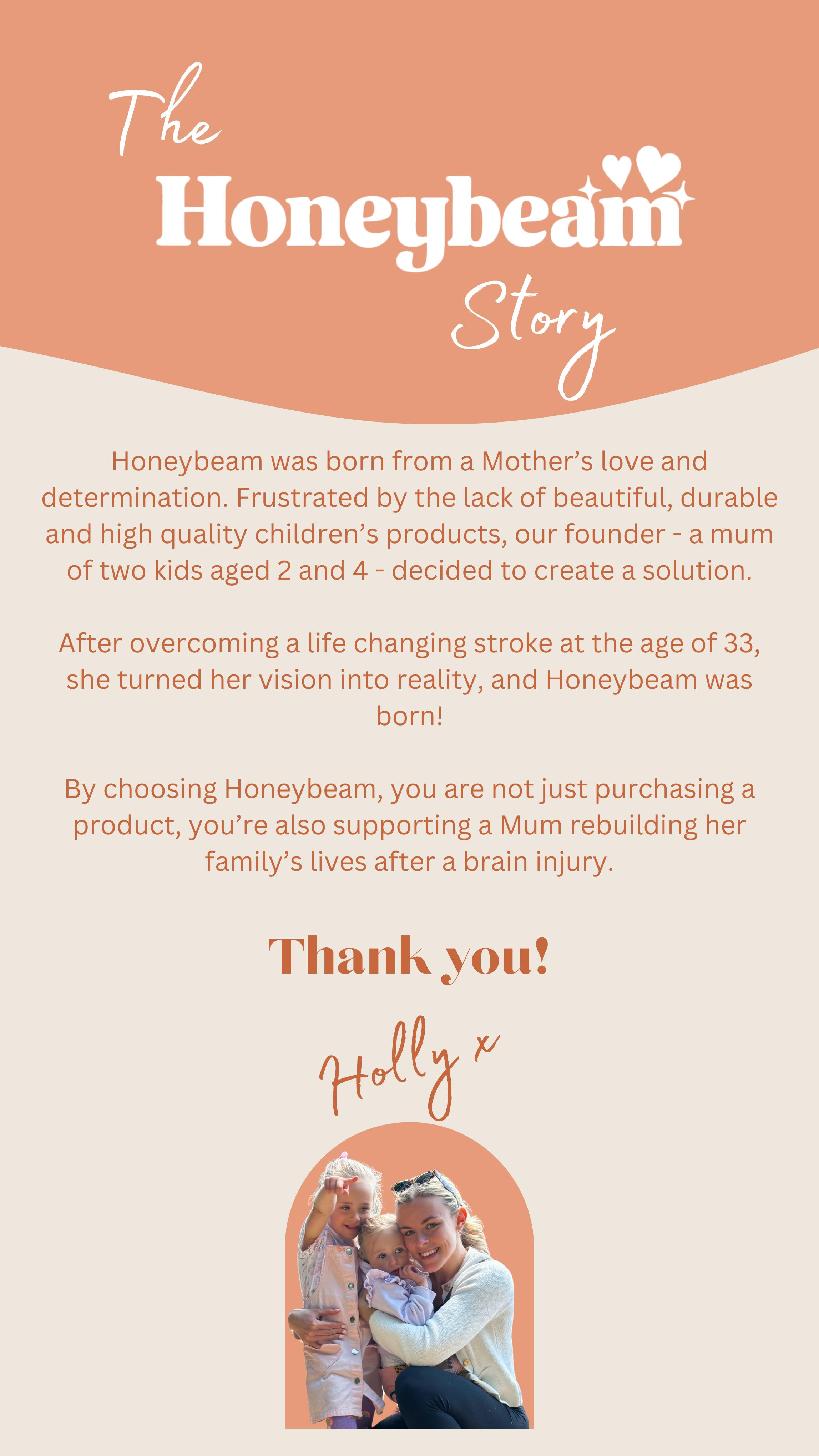 - Iconic Honeybeam flair – bold front badge and four collectable designs that will delight little ones.